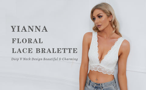 YIANNA Lace Bralette, Women's Deep V Neck Unpadded Lace Long Line Plunge Bralette Bra