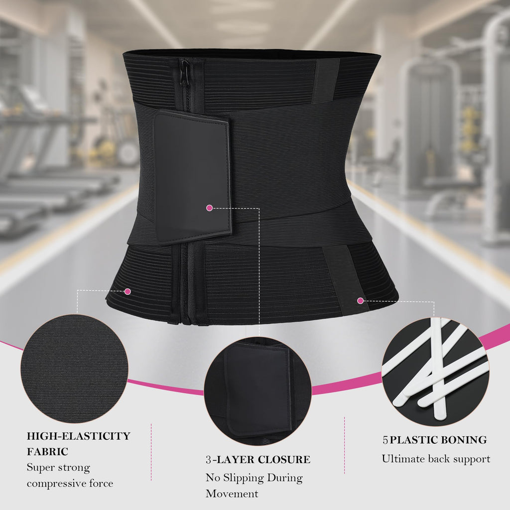 • 3-Layer Closure (Hook-and-Eye + Zipper + Velcro) – No Slipping During Movement Designed with a 3-in-1 secure closure system: inner hook for precise fitting, middle zipper for tight locking, and outer velcro for extra stability. This triple protection keeps the waist trainer in place—no shifting, rolling, or slipping, even during high-intensity workouts or sudden movements.